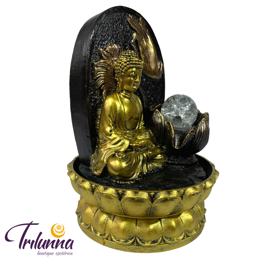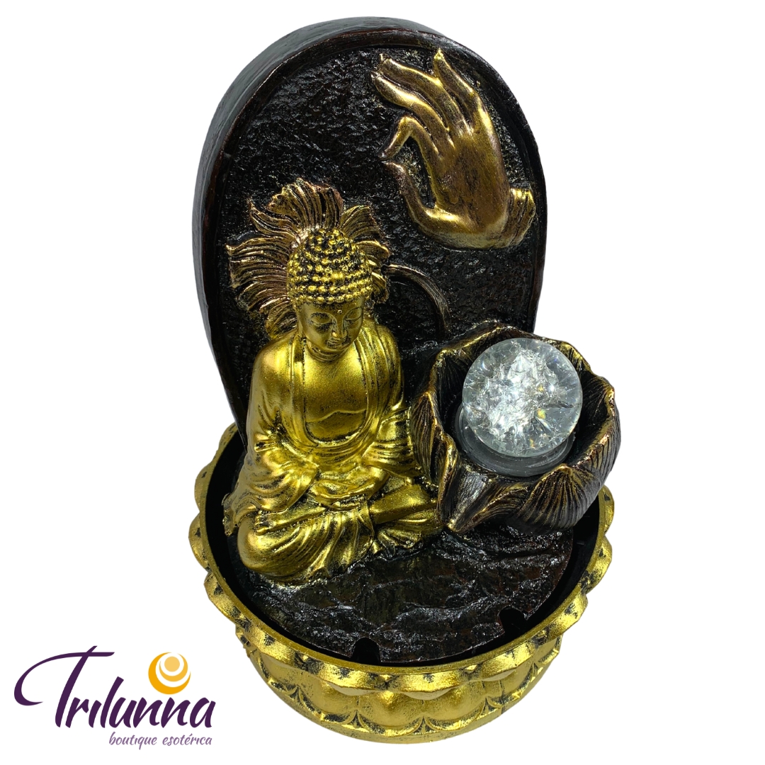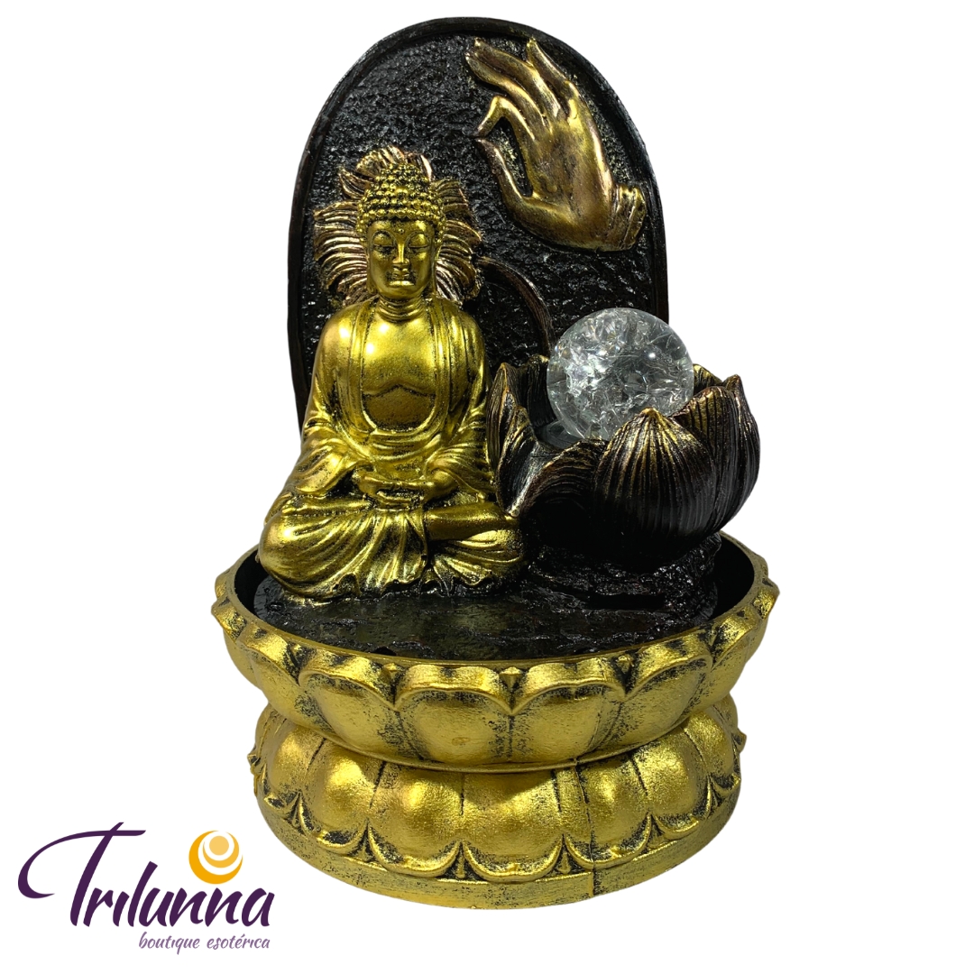 Fonte De Água Decorativa Buda 27,5cm C/Bola Dourado Bivolt – Motor 04 Led´s